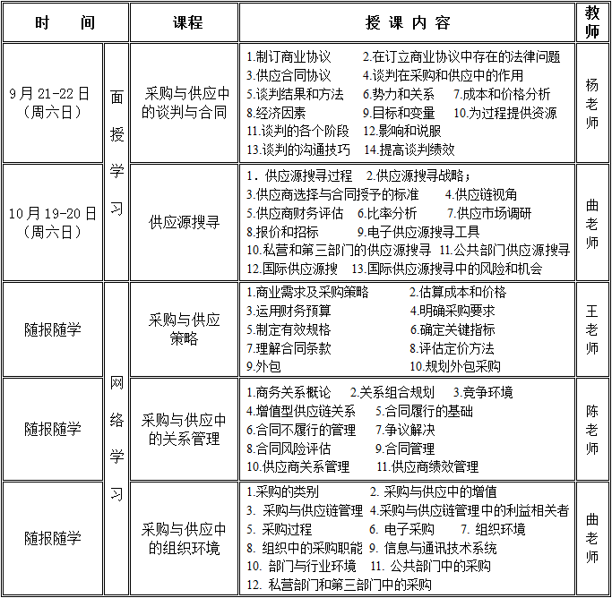 采购管理,供应链管理,合同管理,项目管理,运营管理,生产管理,品类管理,供应商质量保证,采购计划,物流管理等岗位在职人员以及希望提升和扩展采购供应链管理技能各个层面的专业人士(企业亦可采用部分或全部课程作为采购部门培训体系内容)。